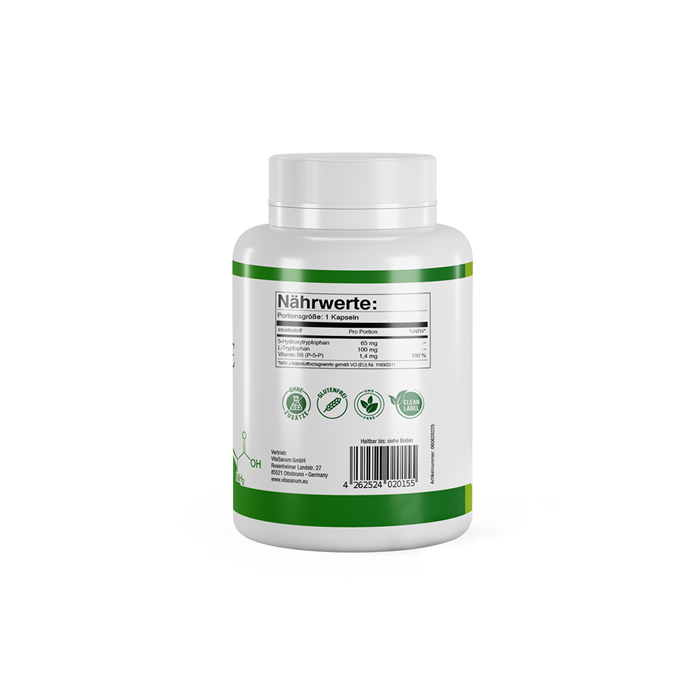 Inhaltsstoff pro Portion % NRV* 5-Hydroxytryptophan 65 mg – L-Tryptophan 100 mg – Vitamin B6 (P-5-P) 1,4 mg 100 % *NRV = Nährstoffbezugswerte gemäß VO (EU) Nr. 1169/2011